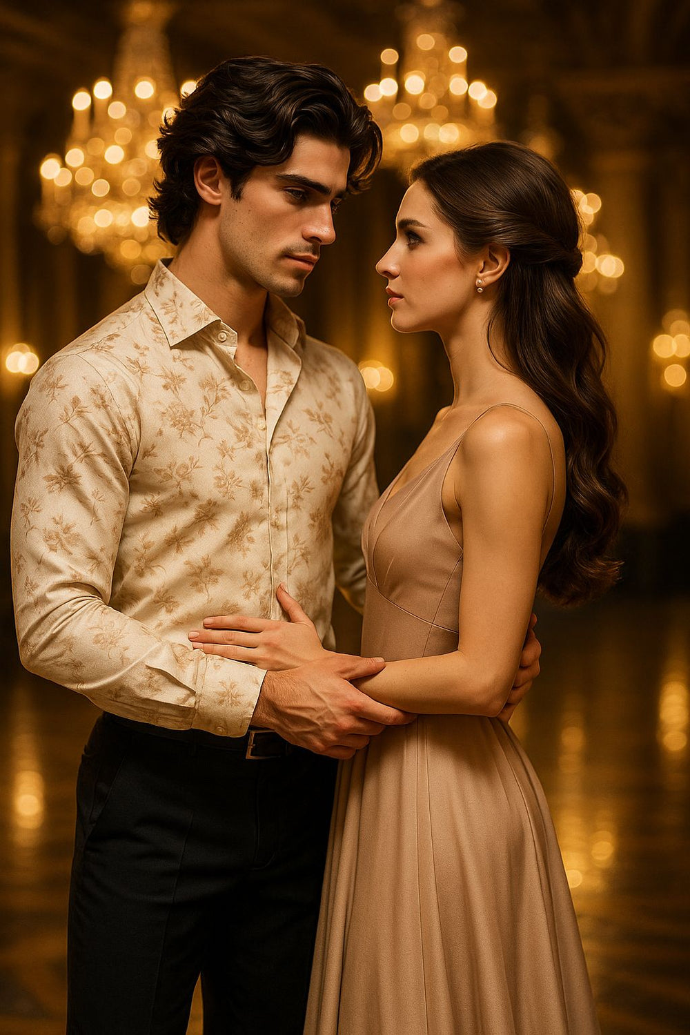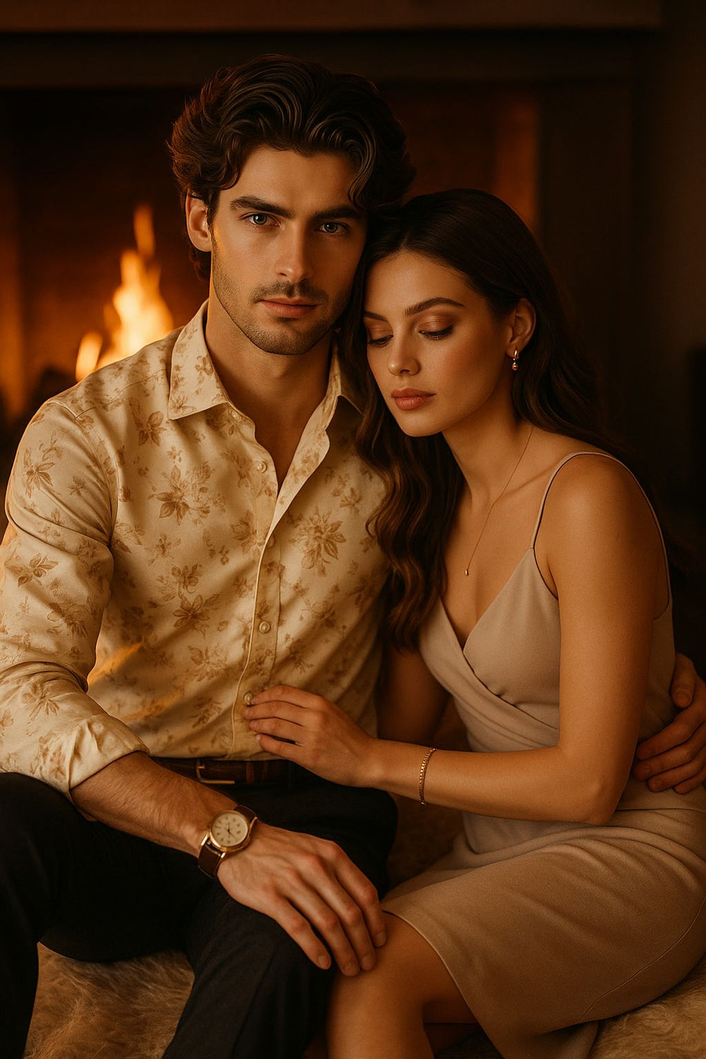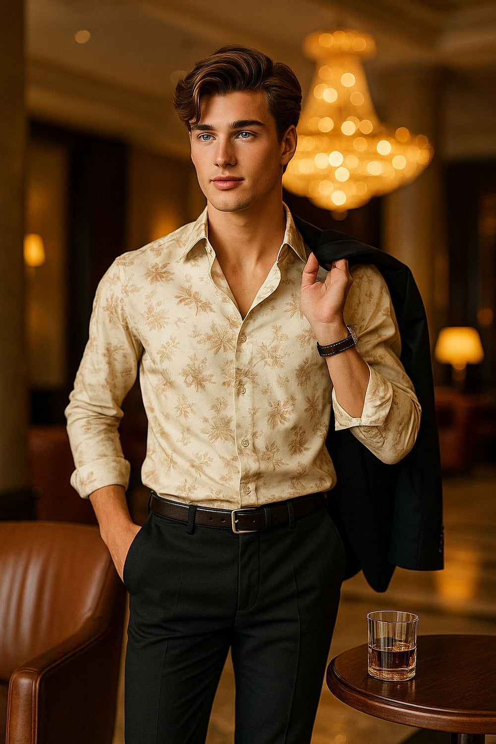 Beige Floral Satin Shirt for Men | Luxury Slim Fit Party Wear