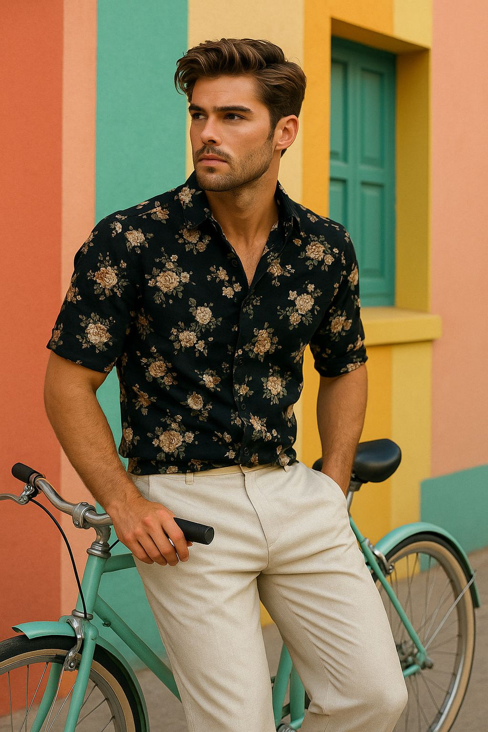 Own the sunset vibe with this black floral short sleeve shirt for men, tailored in a slim fit for the perfect blend of comfort and bold style. The deep black base with soft beige floral patterns creates a classy yet trendy look, making it an ideal pick for beach parties, evening outings, and vacation wear.