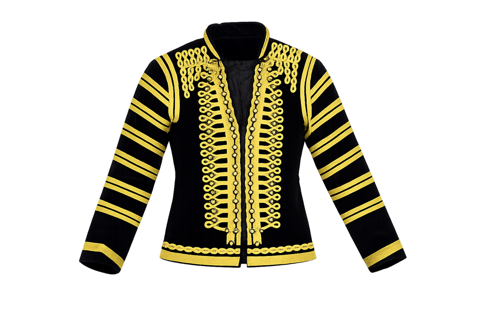 Make a bold statement with this royal black and gold embroidered jacket, inspired by classic military and ceremonial fashion. Designed with intricate gold thread embroidery, this jacket features detailed front patterns and horizontal sleeve accents that give it a powerful, regal look.
