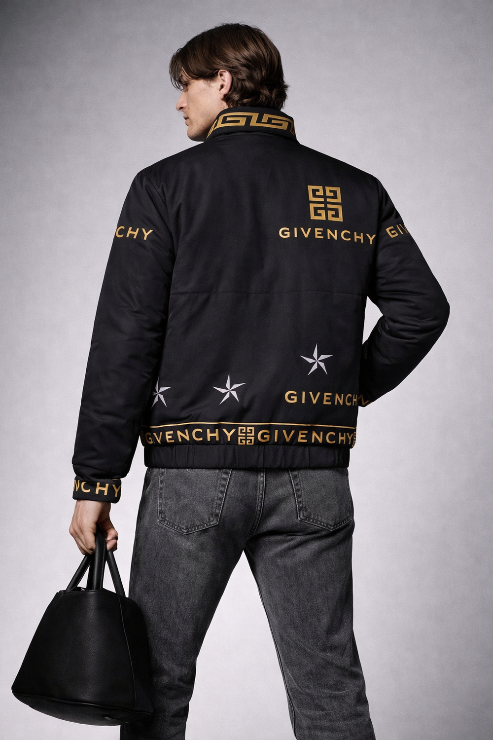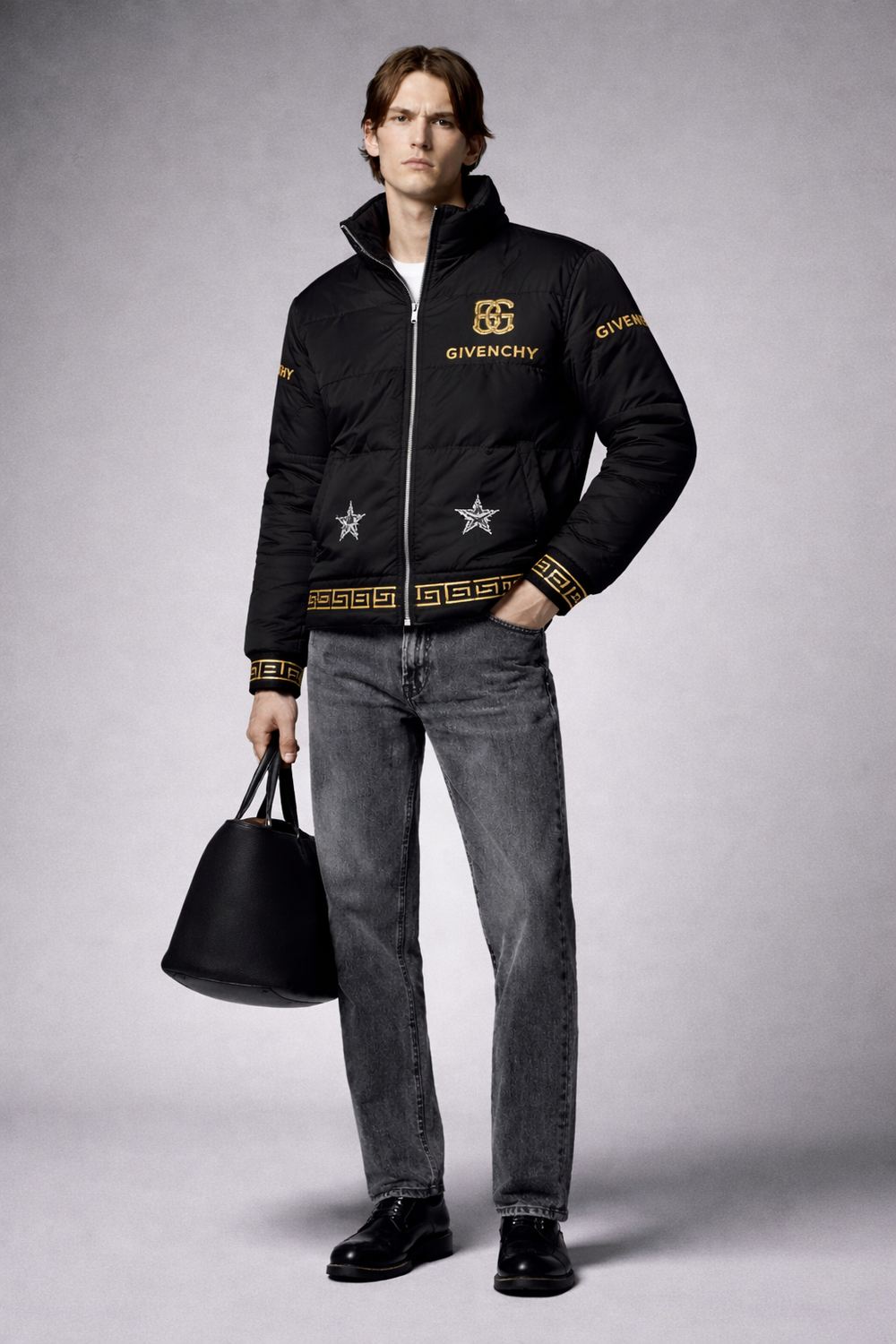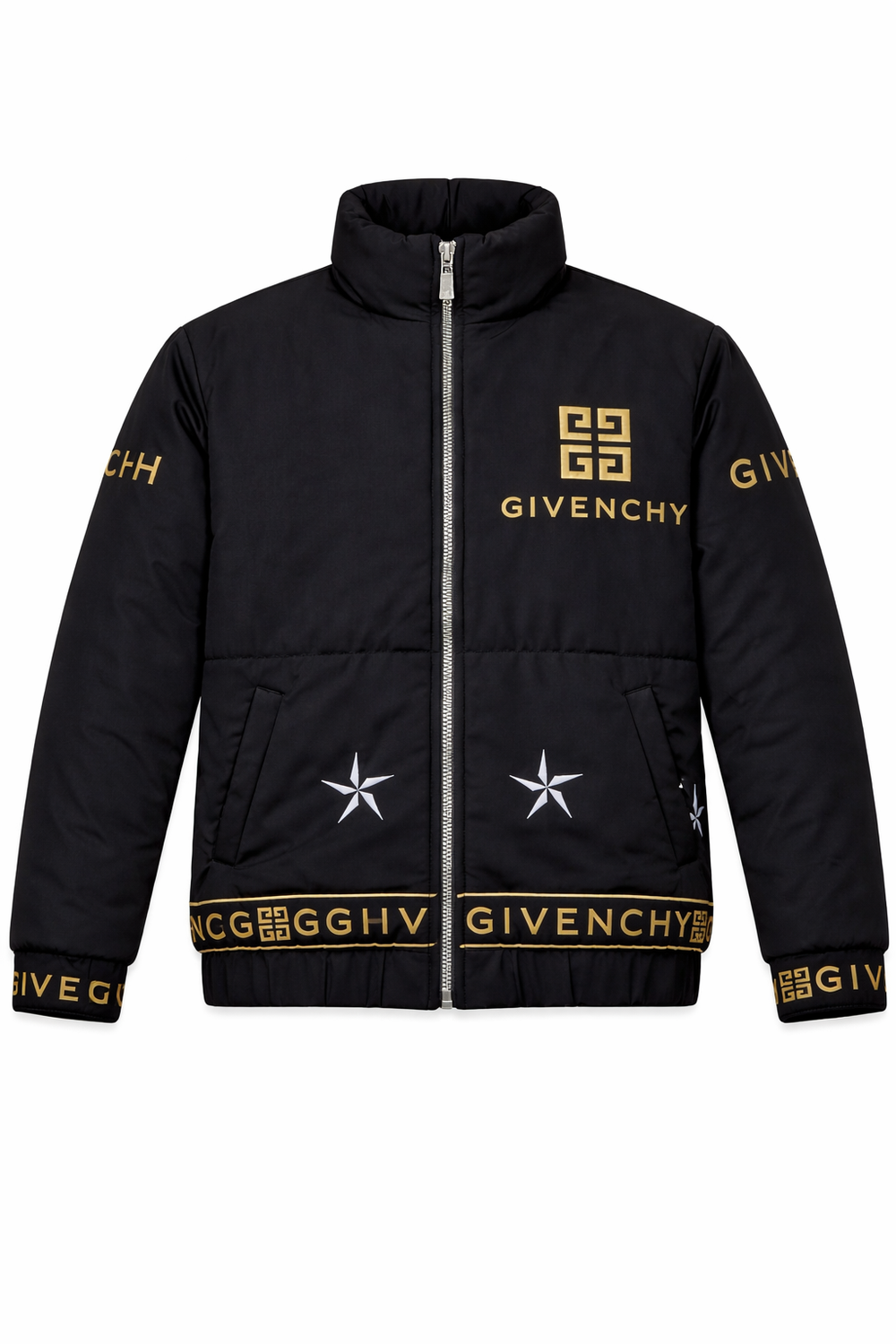 Black Puffer Jacket with Gold Logo Print ā High Neck Zip Closure