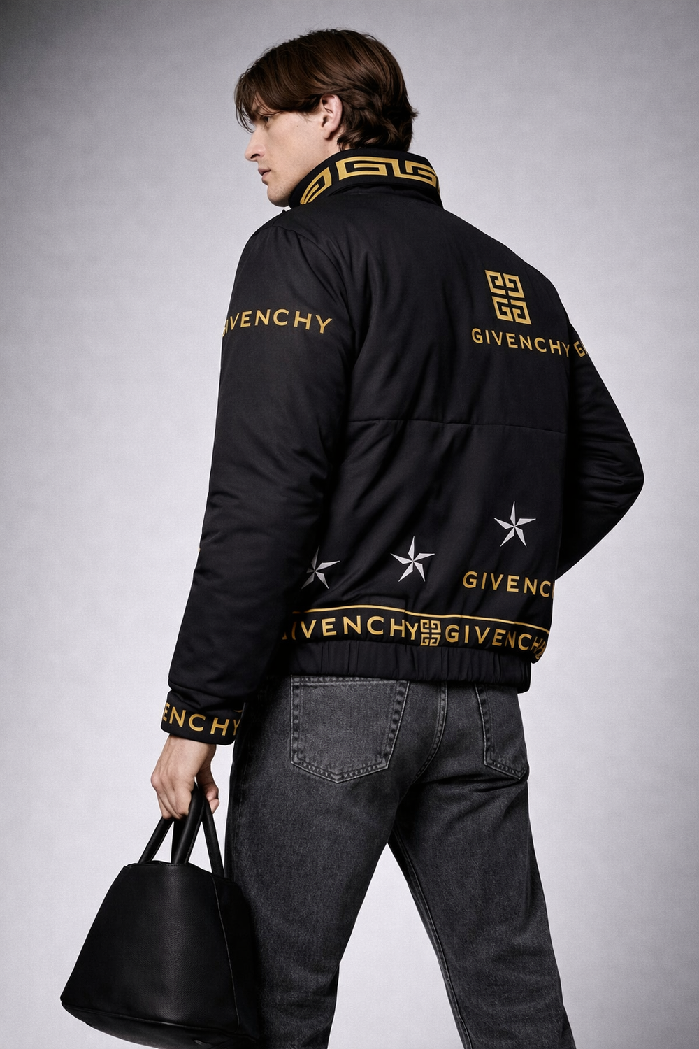 Elevate your winter style with this premium black puffer jacket featuring striking gold logo detailing. Designed with a high-neck collar and full front zip closure, this jacket provides excellent warmth and a sleek, modern look. The padded construction ensures comfort in cold weather, while the contrast gold prints on the chest, sleeves, and hem add a bold luxury-inspired touch. Perfect for winter wear, casual outings, and statement streetwear looks.