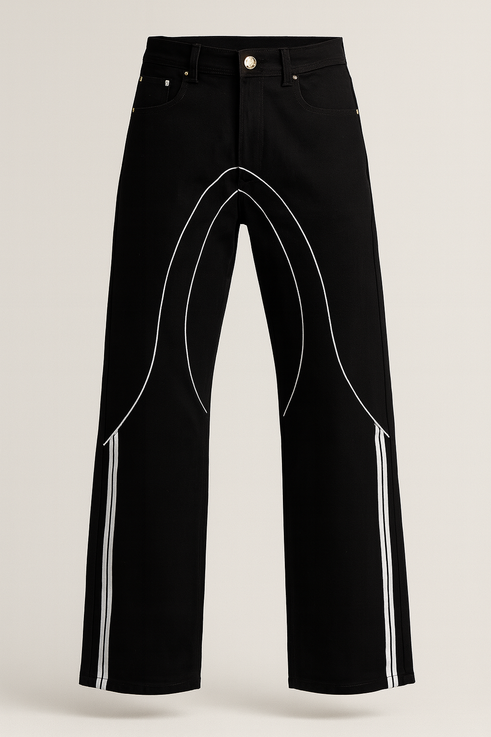 These black arc-line jeans blend streetwear style with luxury fashion—perfect for daily wear, shoots, and statement looks.