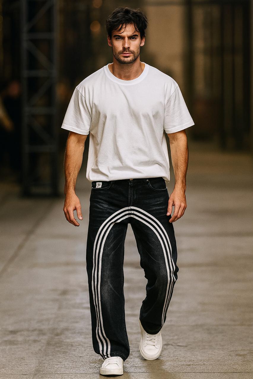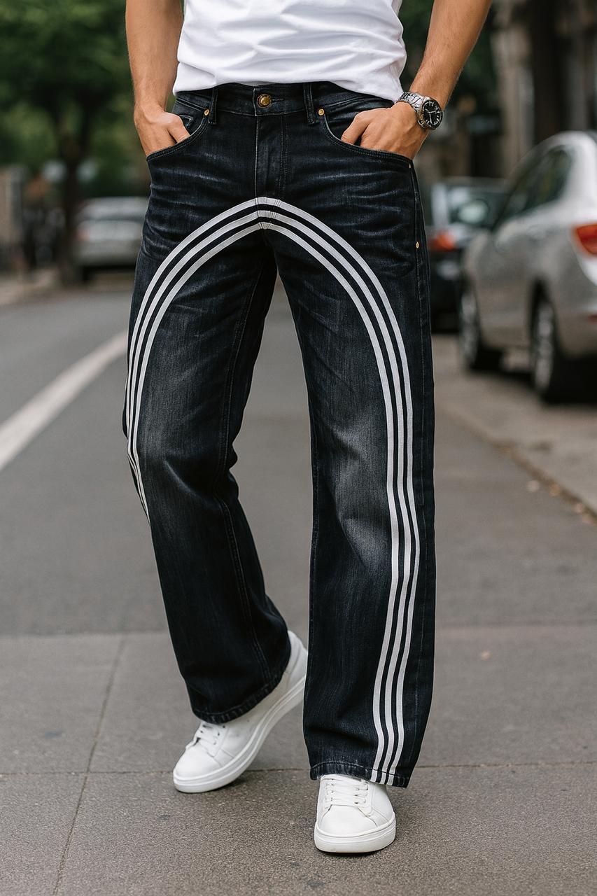 Black Streetwear Wide-Leg Jeans with White Arc Stripe Detailing β Premium Urban Style