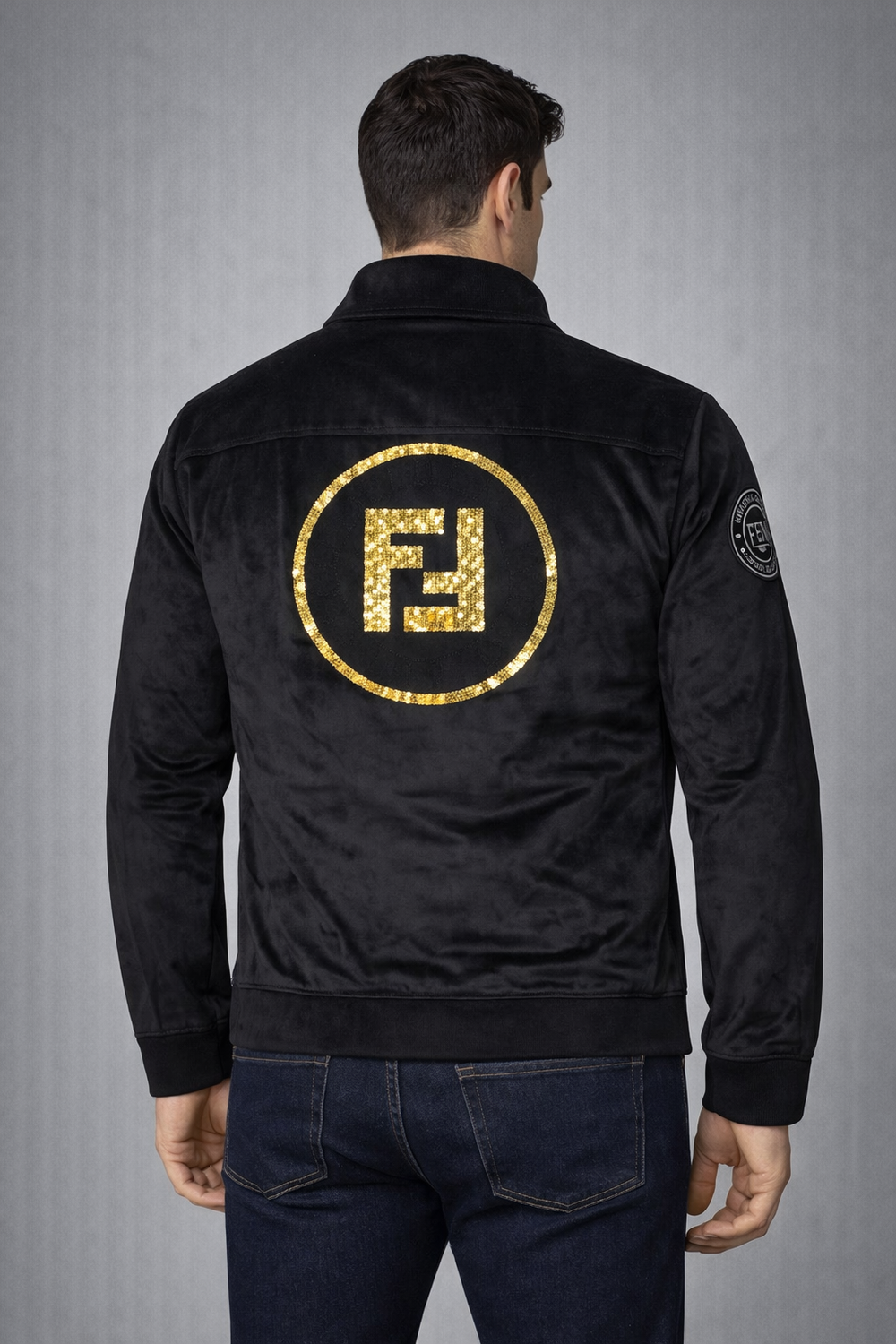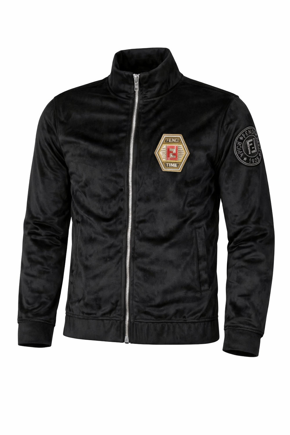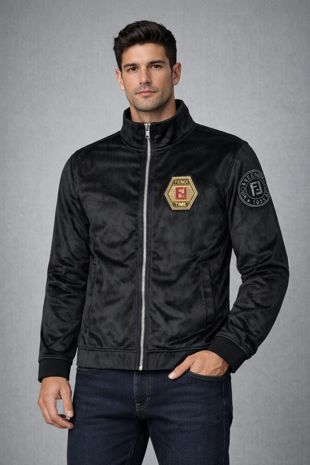 Elevate your everyday style with this FENDI-inspired black zip-up jacket, designed with a sleek and modern silhouette. Crafted from a soft velvet-finish fabric, this jacket delivers a luxurious feel while maintaining a sporty, versatile look.