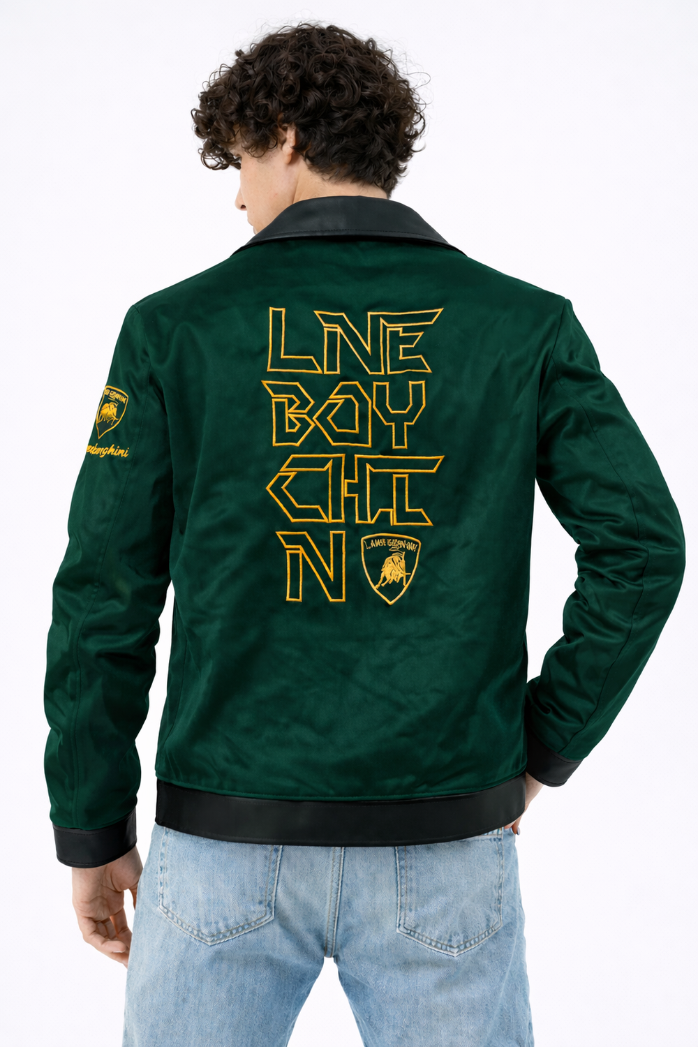 Make a bold statement with this premium Lamborghini-inspired biker jacket. Crafted in a vibrant emerald green satin-finish fabric, this piece features high-contrast gold-tone embroidery showcasing the iconic Raging Bull emblem and Lamborghini typography on the sleeves.