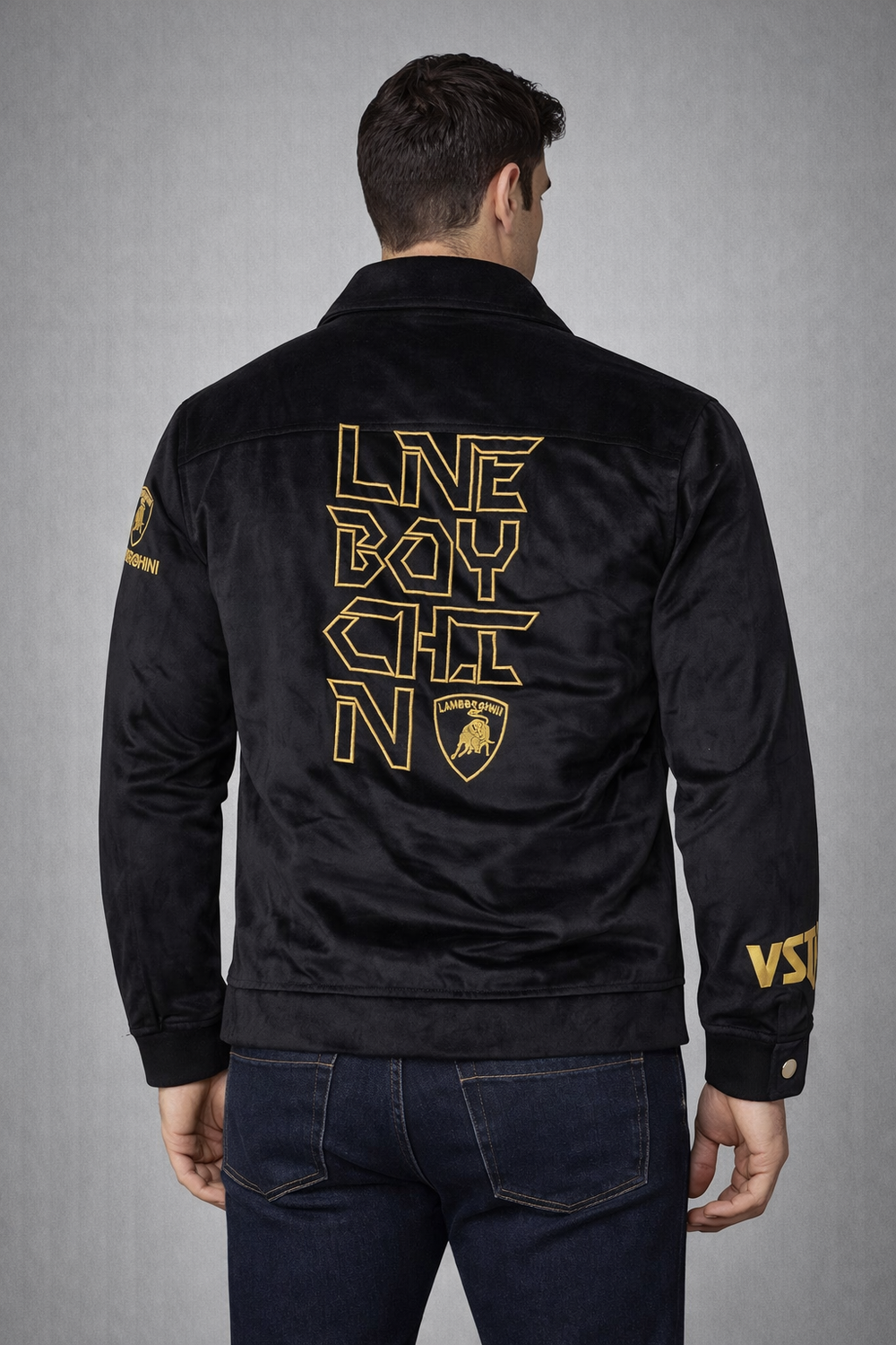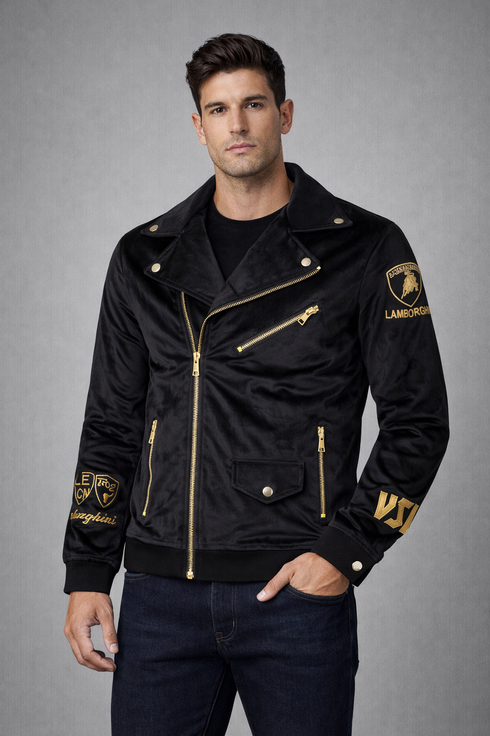 Make a powerful style statement with this Lamborghini-inspired black biker jacket, designed for men who appreciate luxury, speed, and bold fashion. Crafted in a premium suede-finish fabric, this jacket features gold-tone zippers and hardware that add a sharp, high-end edge to the classic biker silhouette.
