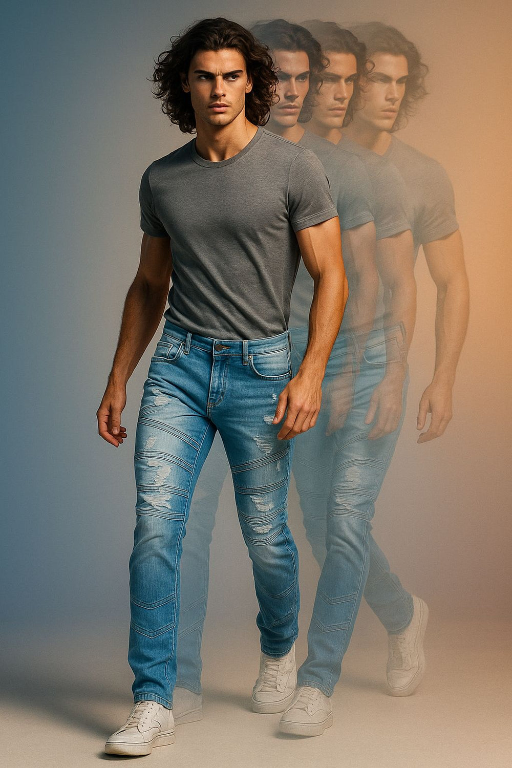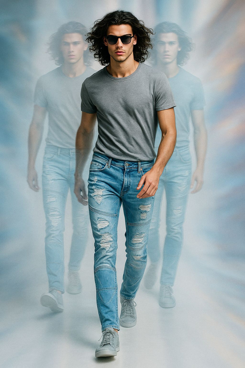 Light Blue Distressed Ripped Jeans for Men – Slim Fit Stretch Denim | Trendy Streetwear