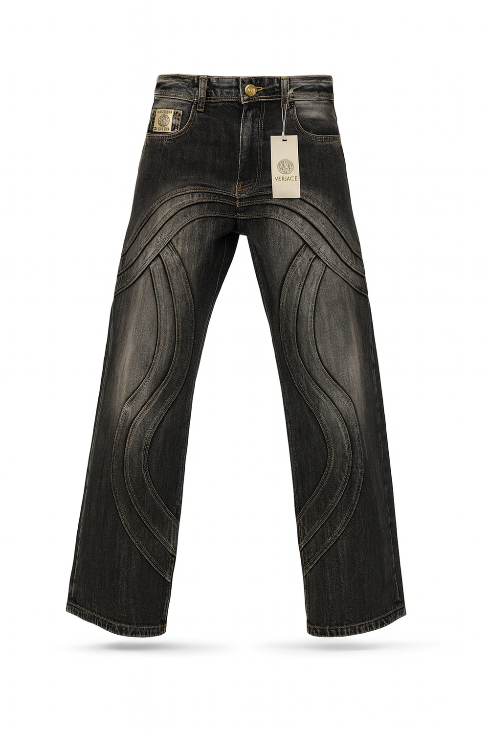 Make a bold style statement with these black wide-leg denim jeans, featuring a unique laser-cut curved panel design on the front. Crafted from premium heavy-wash denim, this pair offers a striking blend of urban edge and modern fashion.