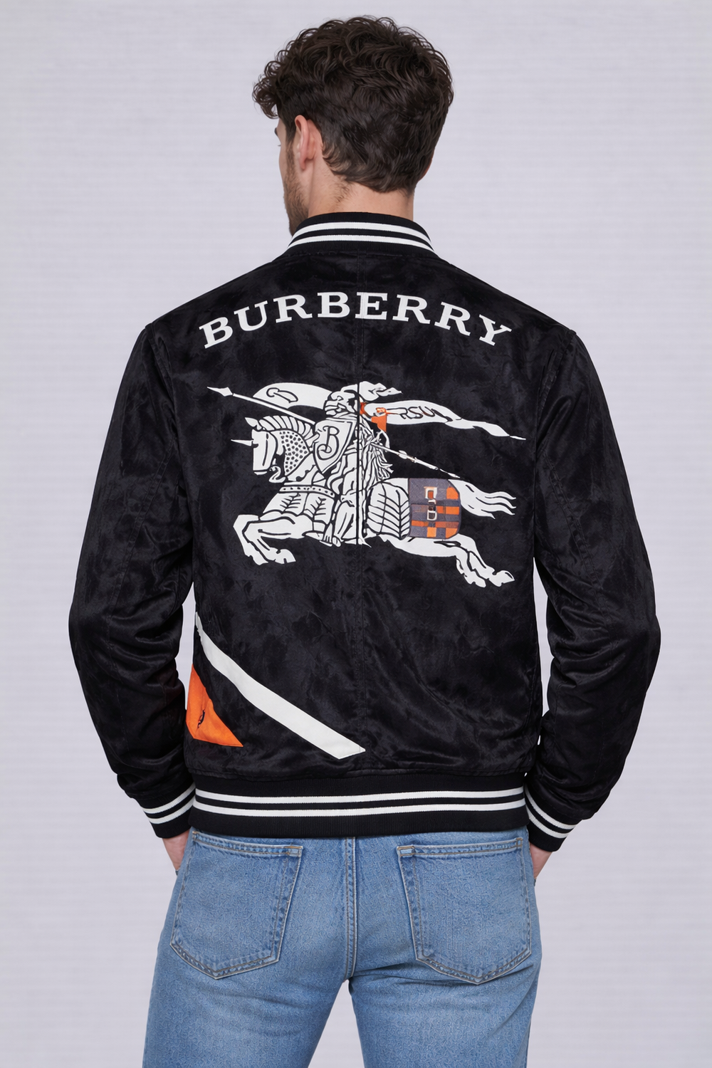 Upgrade your street-style game with this premium black velvet varsity bomber jacket. Designed with a smooth zip-up front and ribbed striped collar, cuffs, and hem, this jacket blends classic varsity vibes with a bold modern edge.