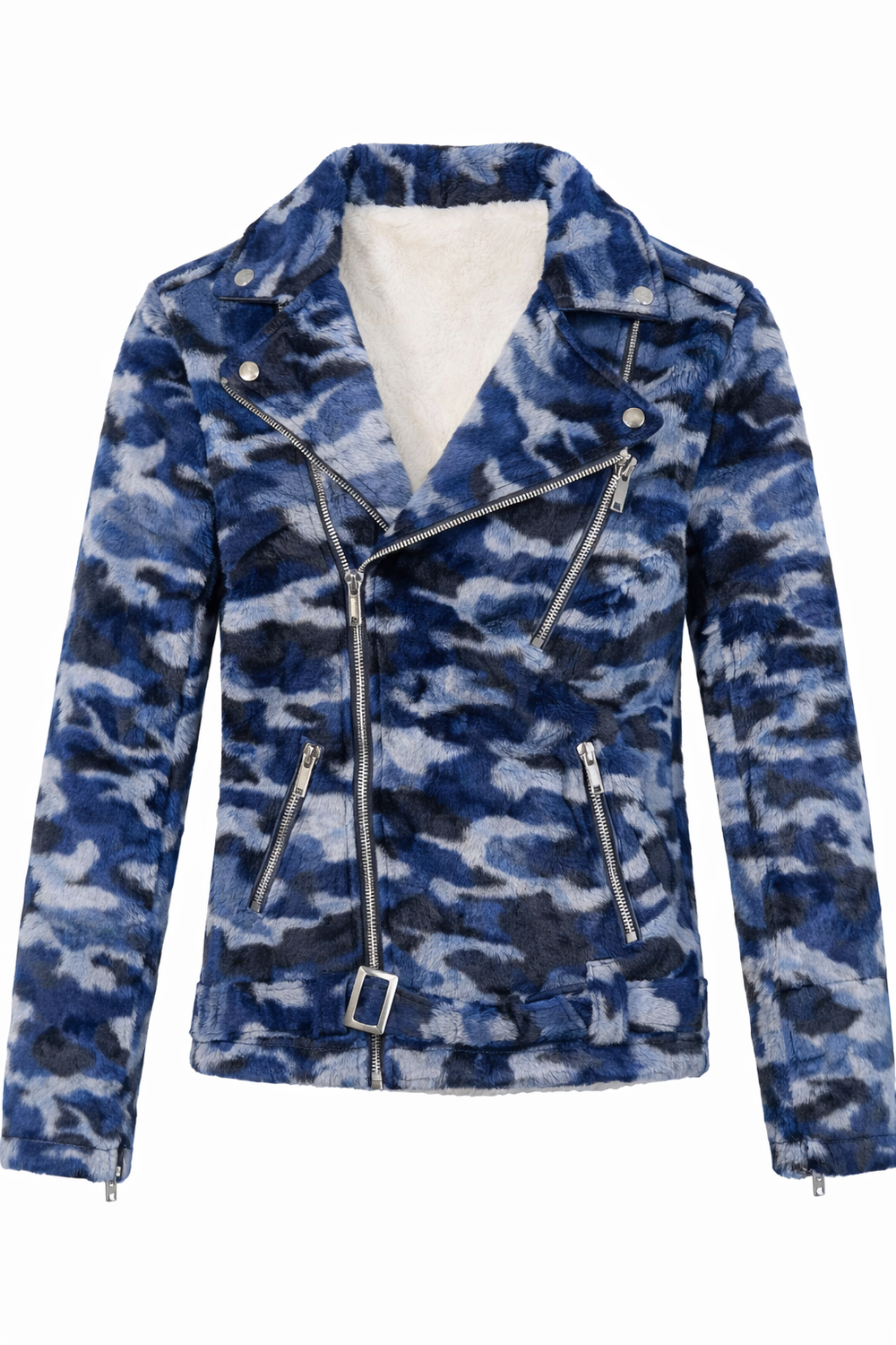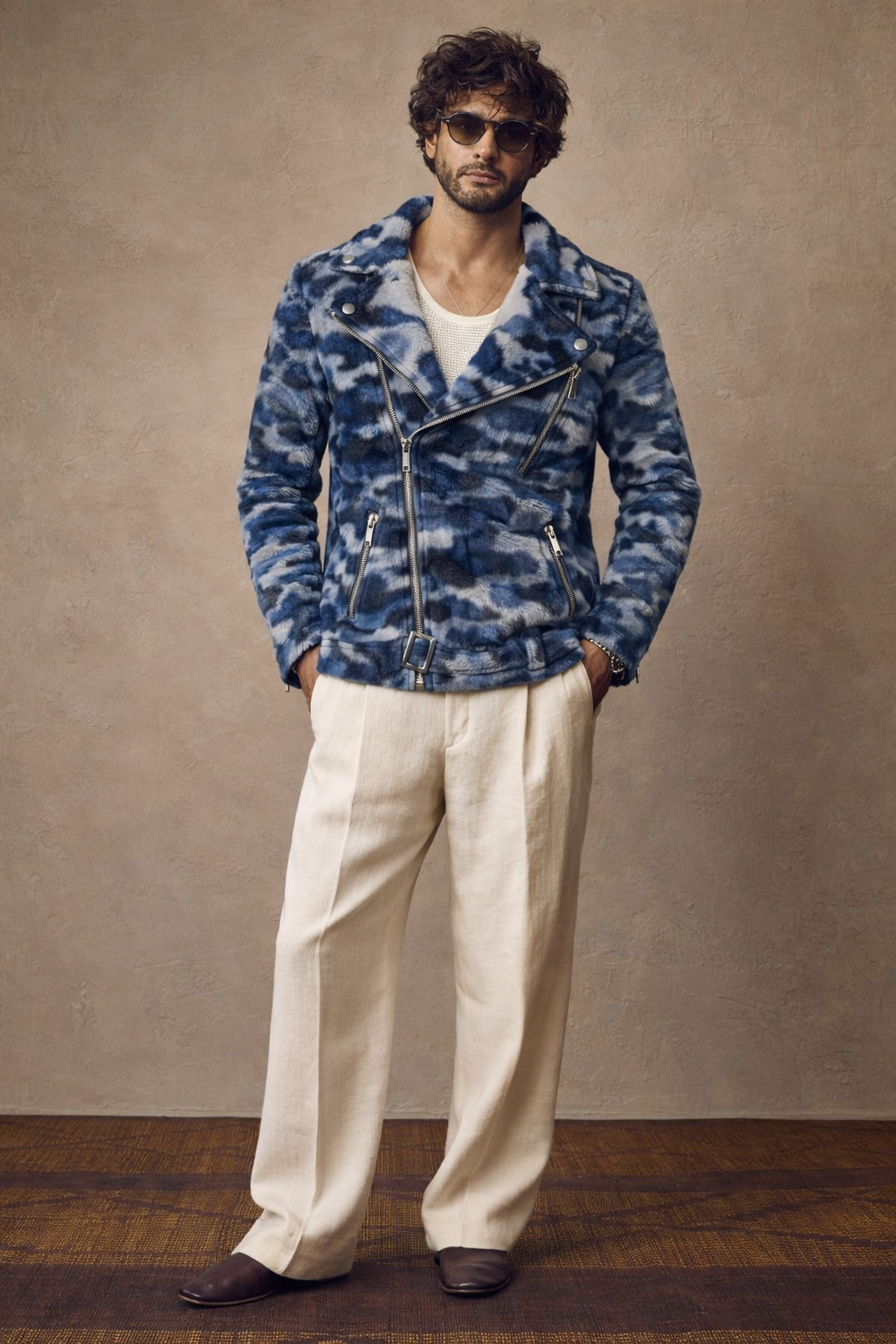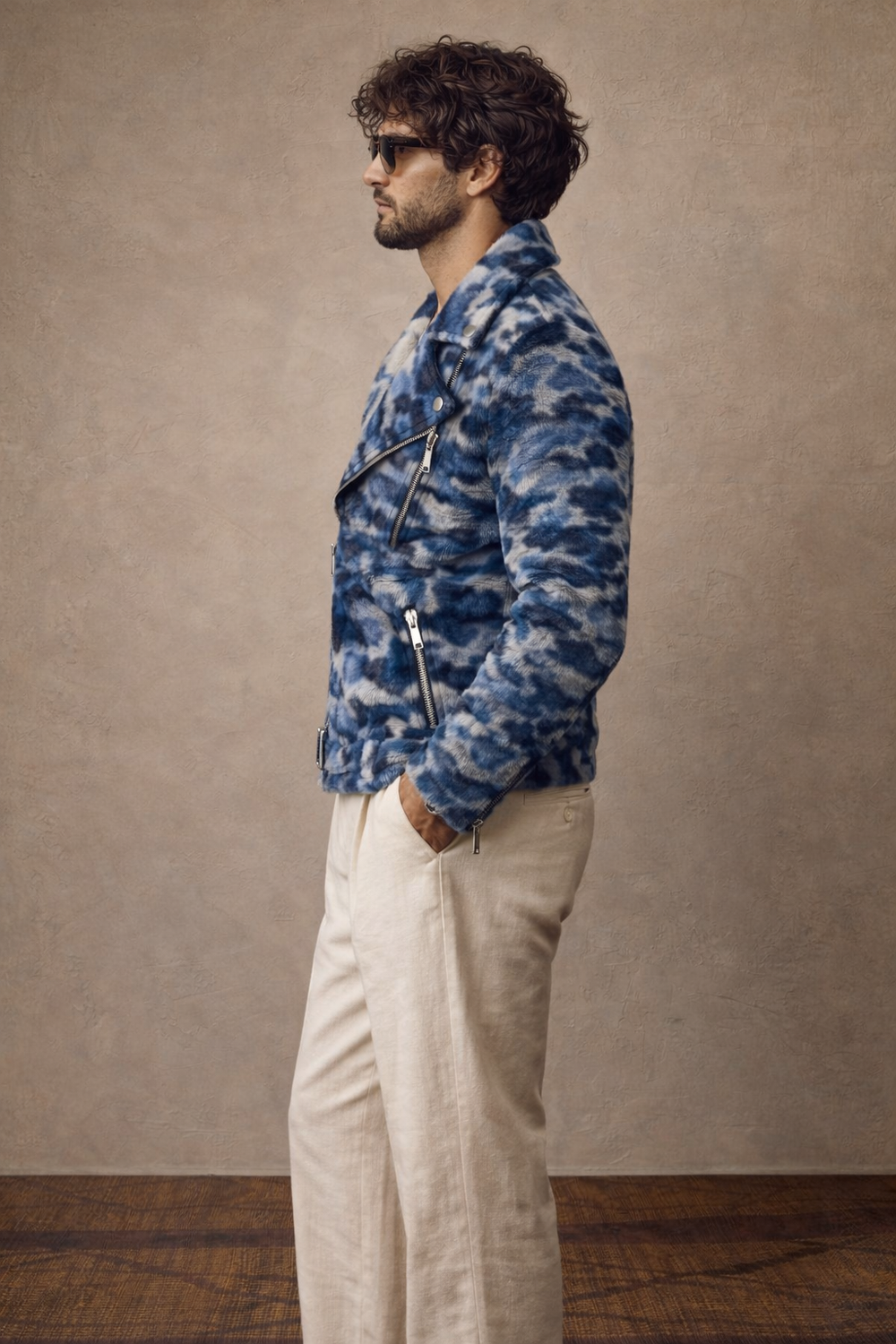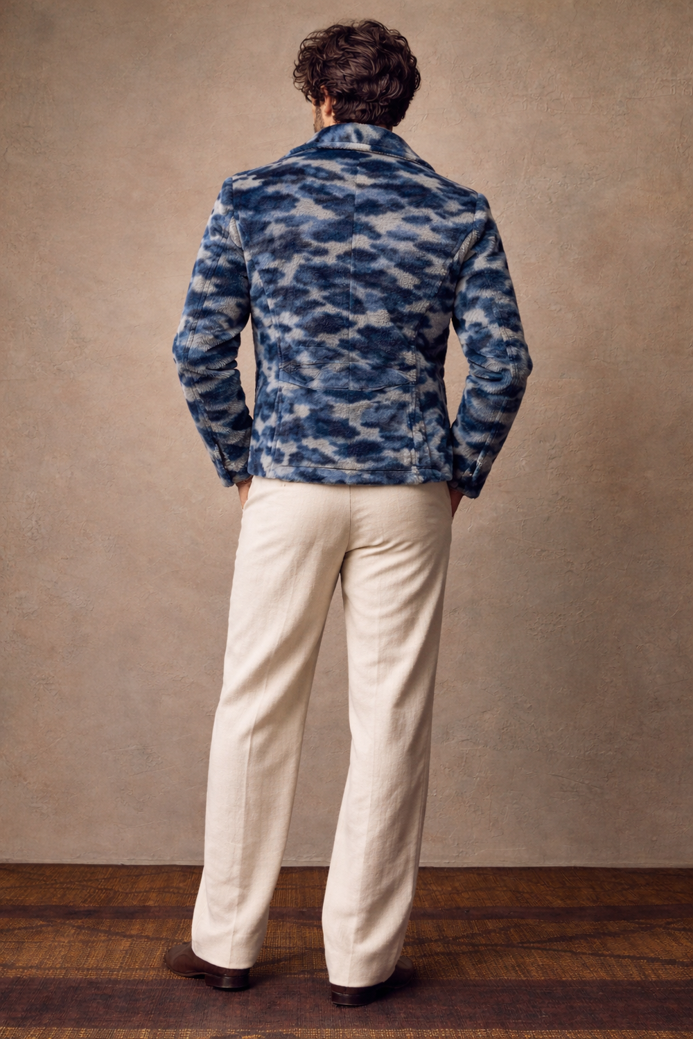 The geometric blue-and-ivory print flows seamlessly along the body, highlighting the slim-fit design while maintaining comfort and flexibility. This pose is ideal to display fit accuracy, jacket length, sleeve finish, and side detailing, making it perfect for e-commerce listings, lookbooks, and premium brand presentations.