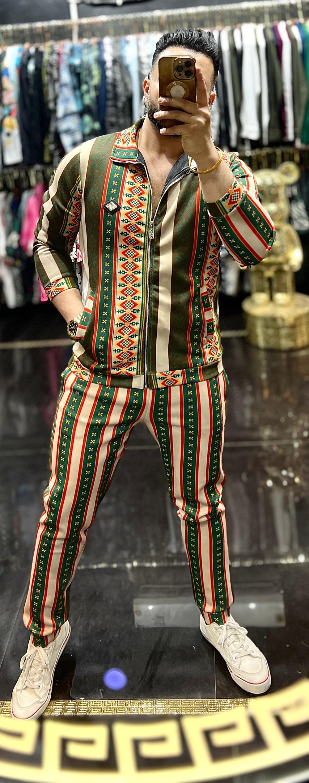 This men’s designer cord set features a luxury ethnic stripe print, inspired by global fashion and cultural detailing. The co-ord outfit includes a zipper jacket and matching slim-fit pants, offering a bold yet refined look.