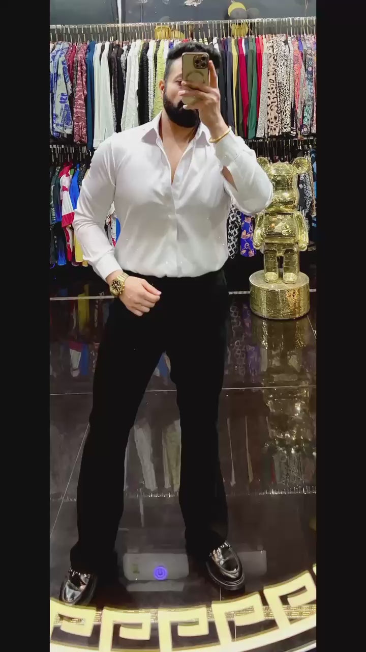 Make a sleek, sophisticated statement with this luxury white crystal-studded shirt, crafted for men who demand elegance with a touch of shine. The premium fabric is soft, comfortable, and tailored to highlight your physique, while the micro crystal detailing adds a subtle, classy sparkle perfect for any high-end occasion.