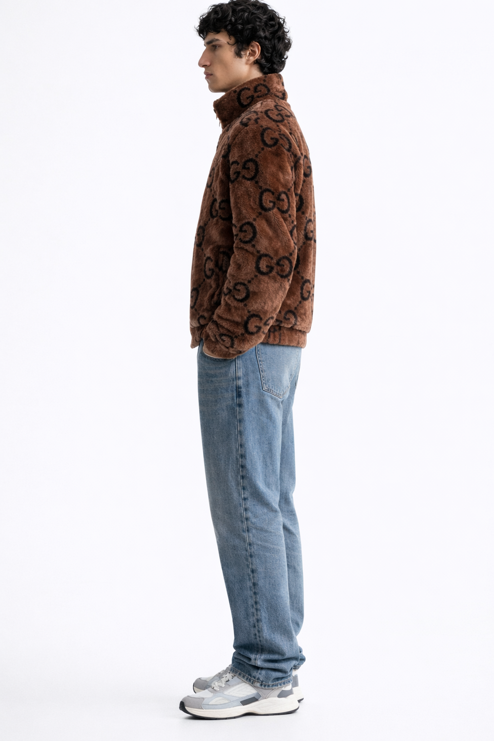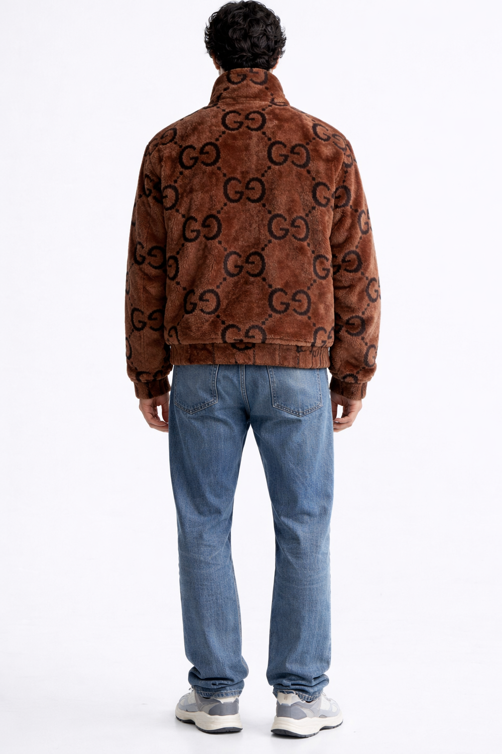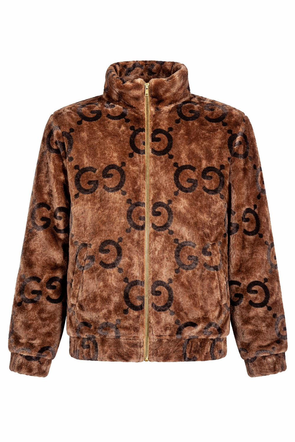 Stay warm without sacrificing style in this striking monogram print faux fur jacket. Designed for those who appreciate bold luxury, this jacket features an all-over "GG" style interlocking logo pattern set against a rich, chocolate brown plush fabric.