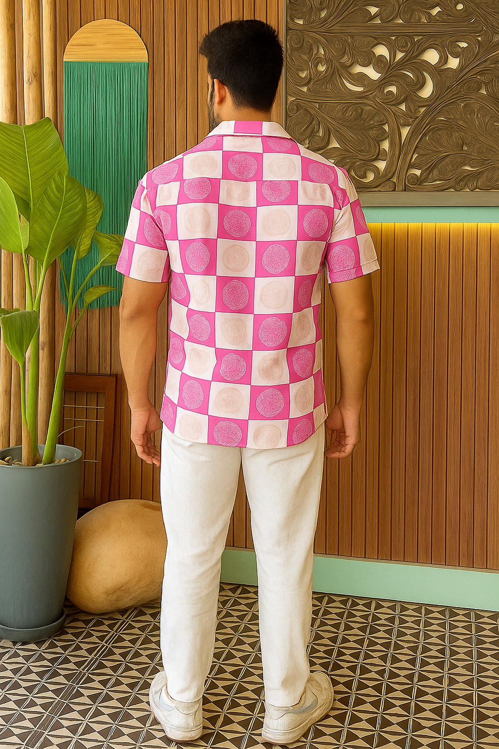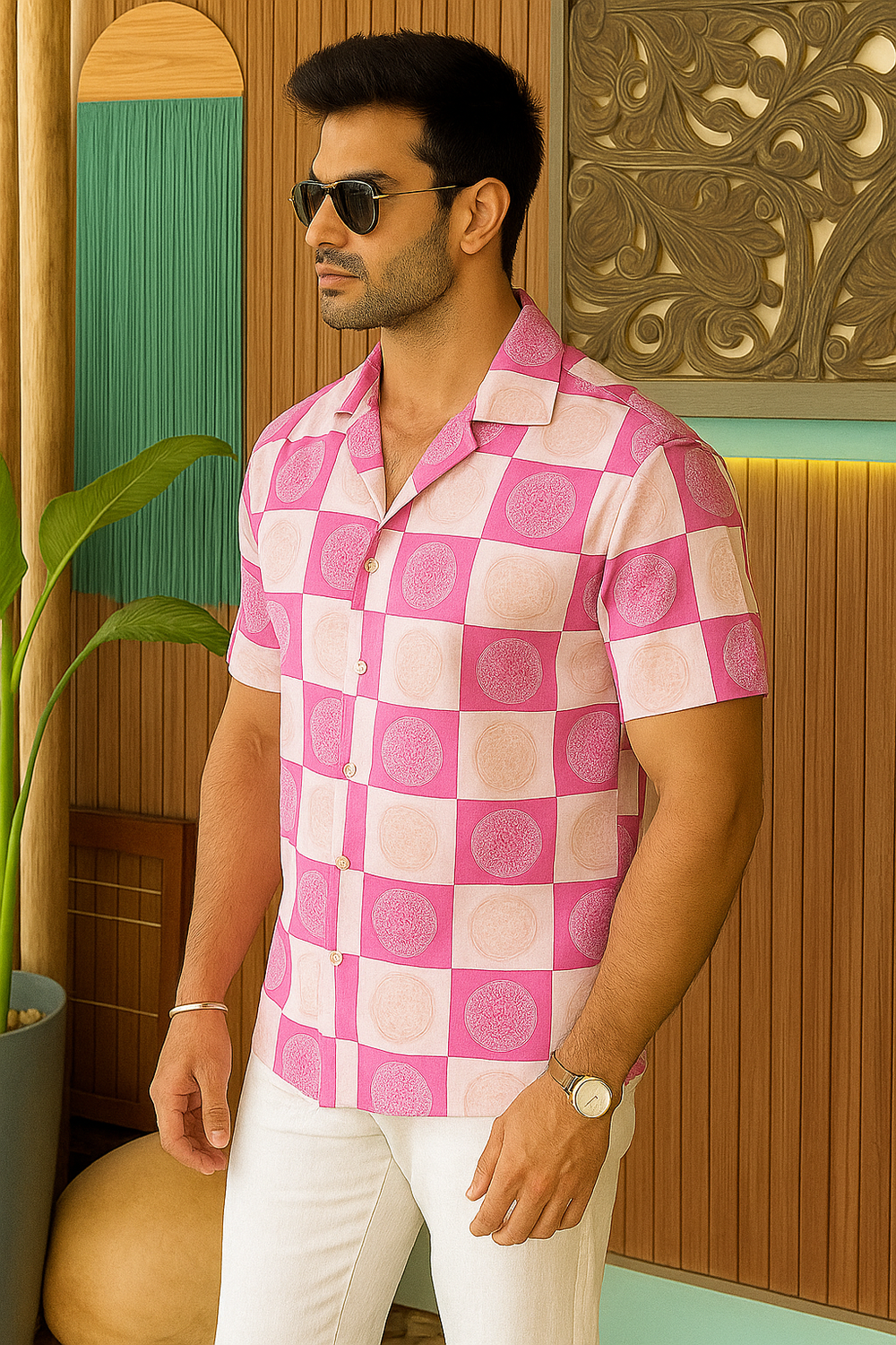 Bring tropical energy to your look with this Men’s Premium Pink & White Printed Shirt from 21 Inside – a perfect choice for casual weekends, beach days, and stylish summer getaways. Designed in a striking geometric circle print and tailored from lightweight imported fabric, this half sleeve shirt offers breathable comfort with a bold statement.