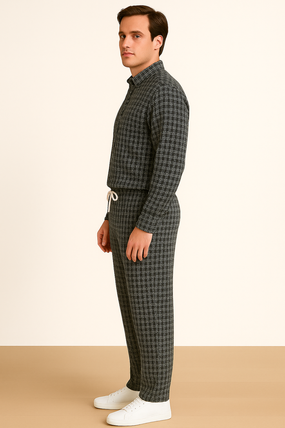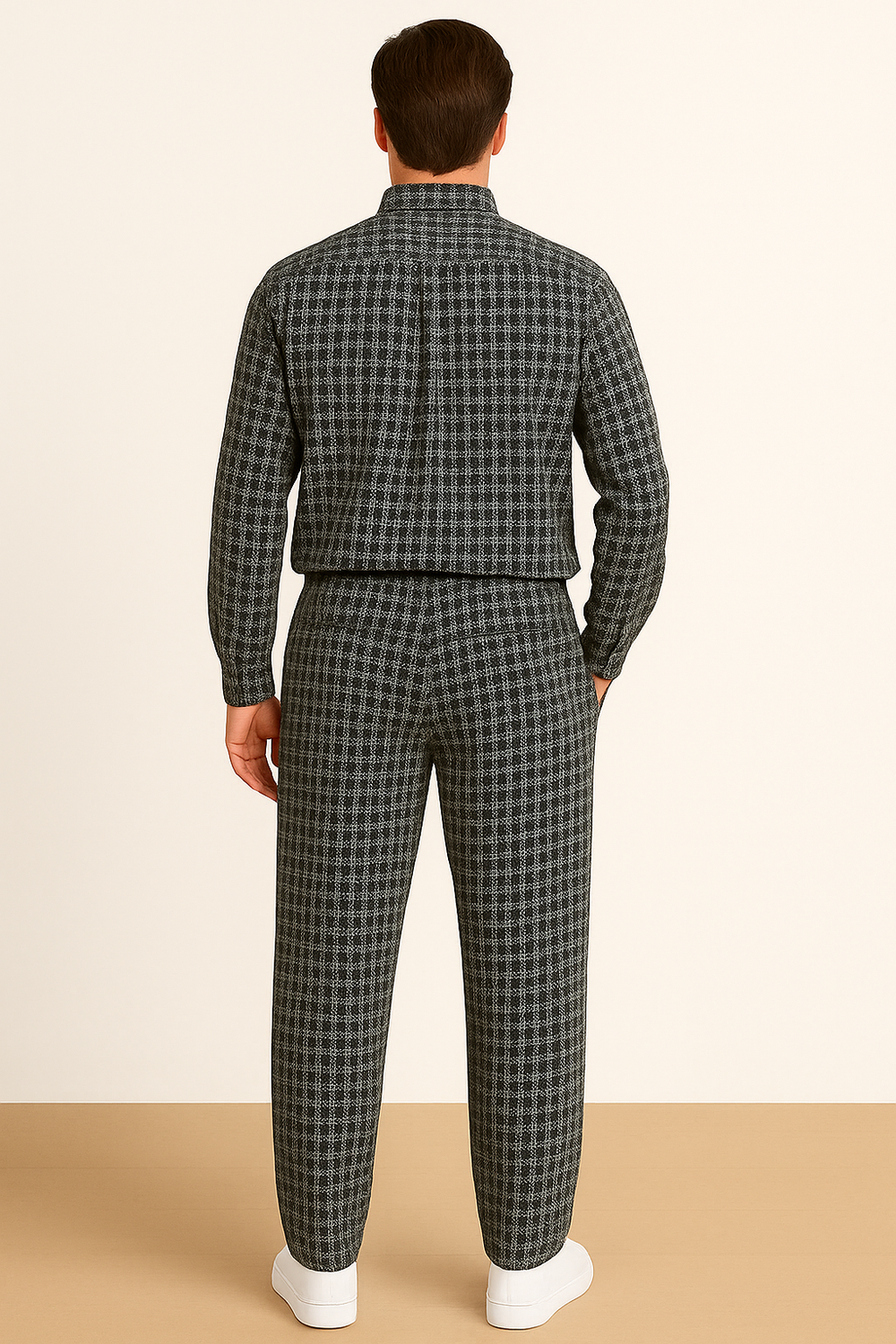 Make a bold and effortless statement with our Black Checked Co-ord Set for Men, crafted from imported 4-way lycra fabric for superior stretch, comfort, and durability. The set features a drop-shoulder full sleeve shirt paired with baggy fit pants, giving you the perfect mix of modern streetwear and luxury lounge style.