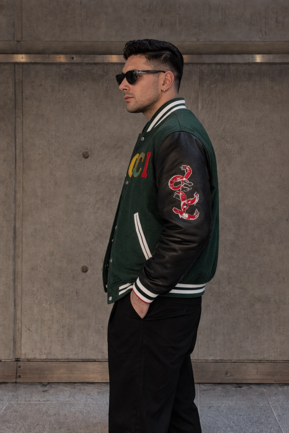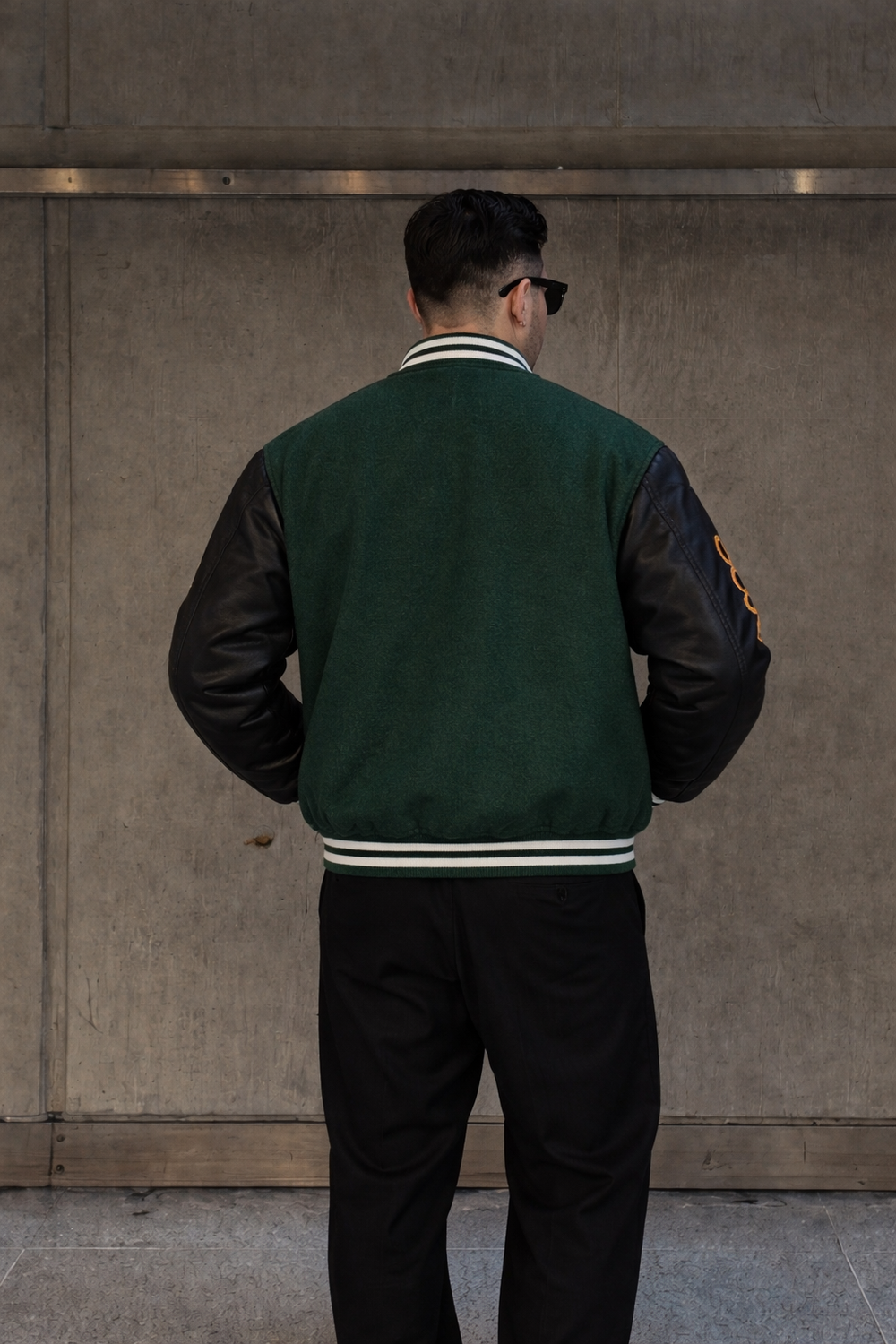 Upgrade your streetwear game with this premium varsity jacket, crafted for a bold yet timeless look. Featuring a rich green wool body paired with contrasting black leather sleeves, this jacket delivers classic college vibes with a modern edge. The ribbed collar, cuffs, and hem ensure a snug, comfortable fit, while the detailed embroidery and patches add a standout personality.