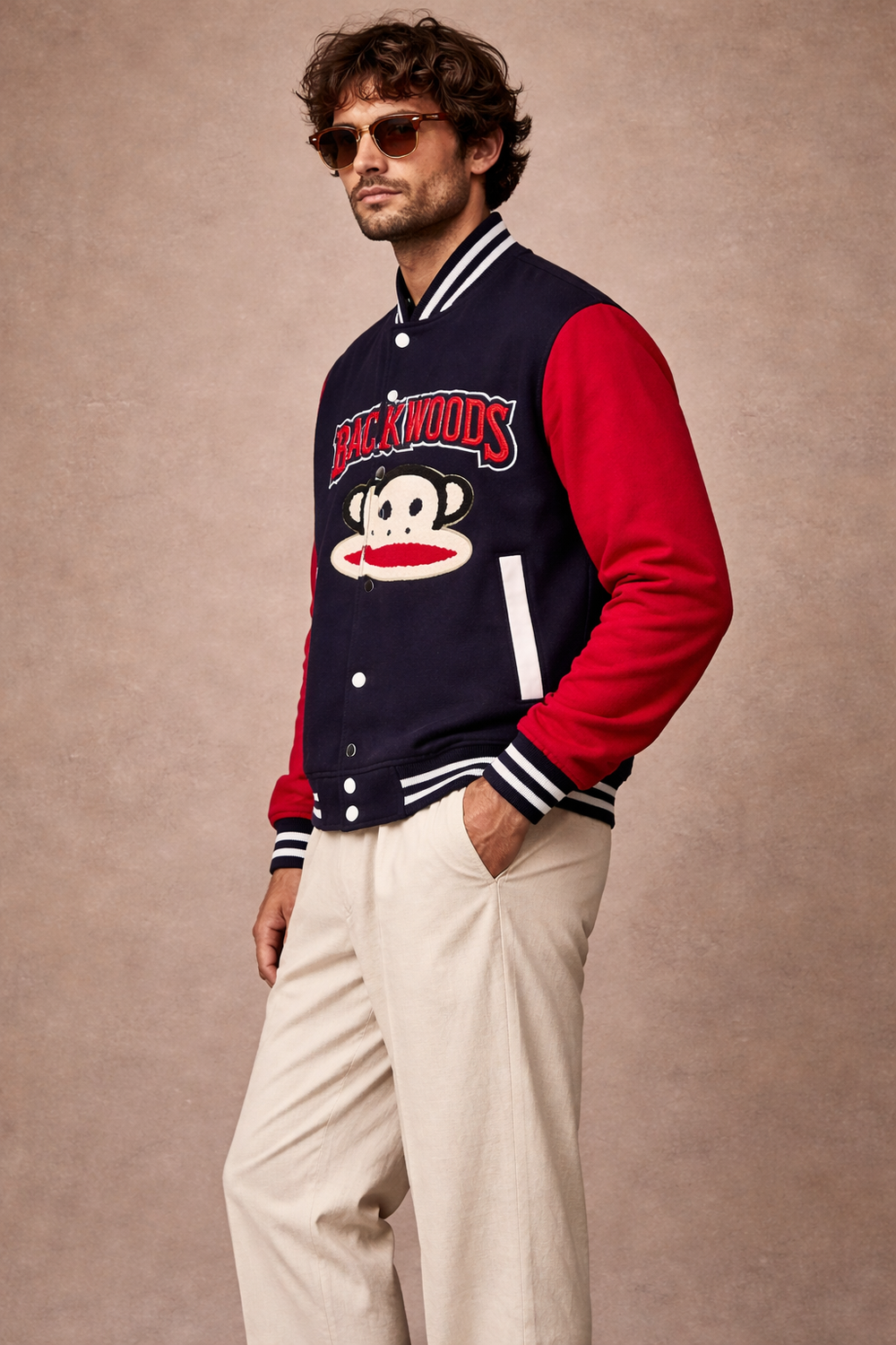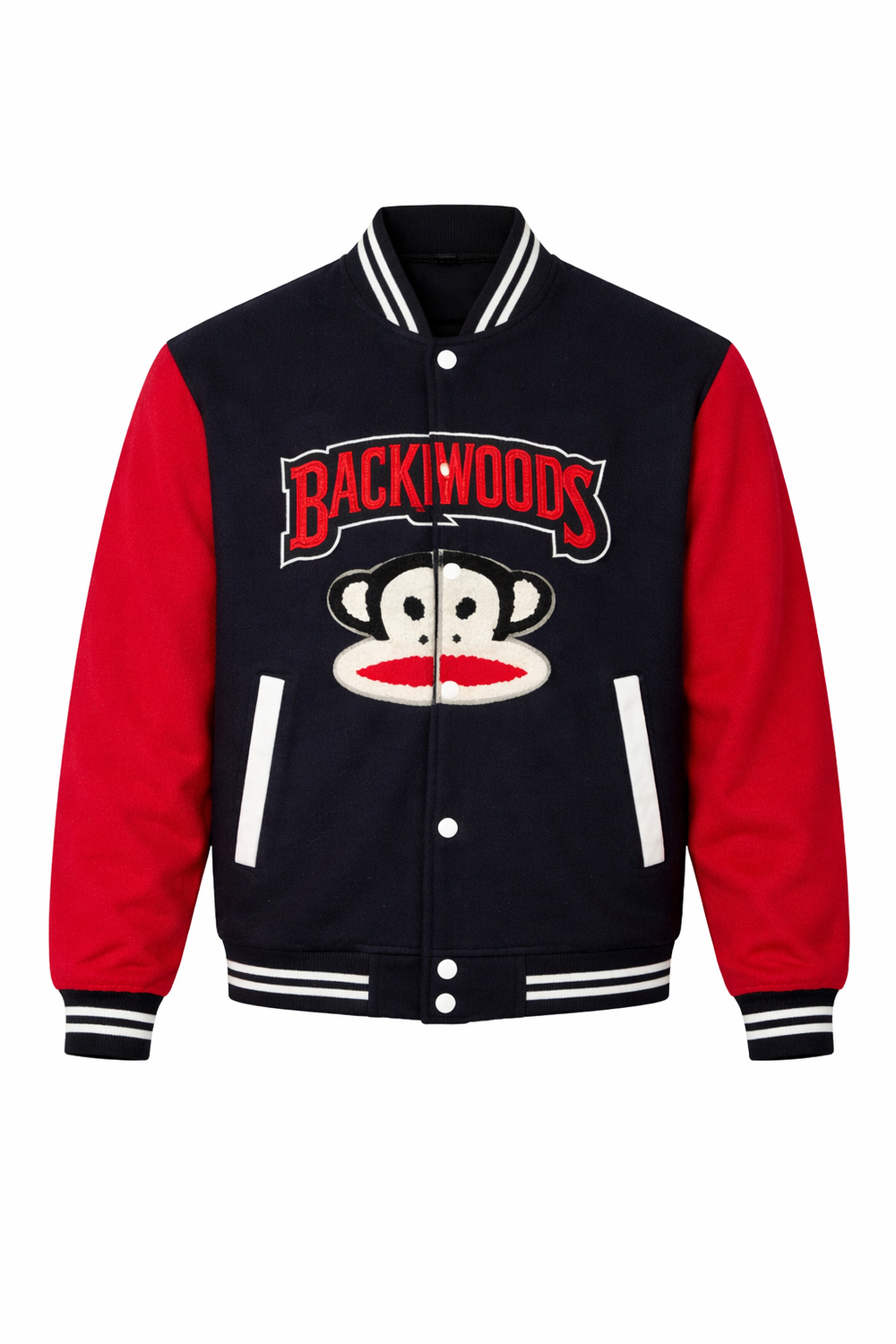 Make a bold statement with our BACKWOODS Premium Varsity Jacket, designed for modern streetwear lovers who want comfort with standout style. Crafted with a classic varsity silhouette, this jacket features a rich navy body with contrasting red sleeves, finished with high-quality ribbed trims for a timeless look.