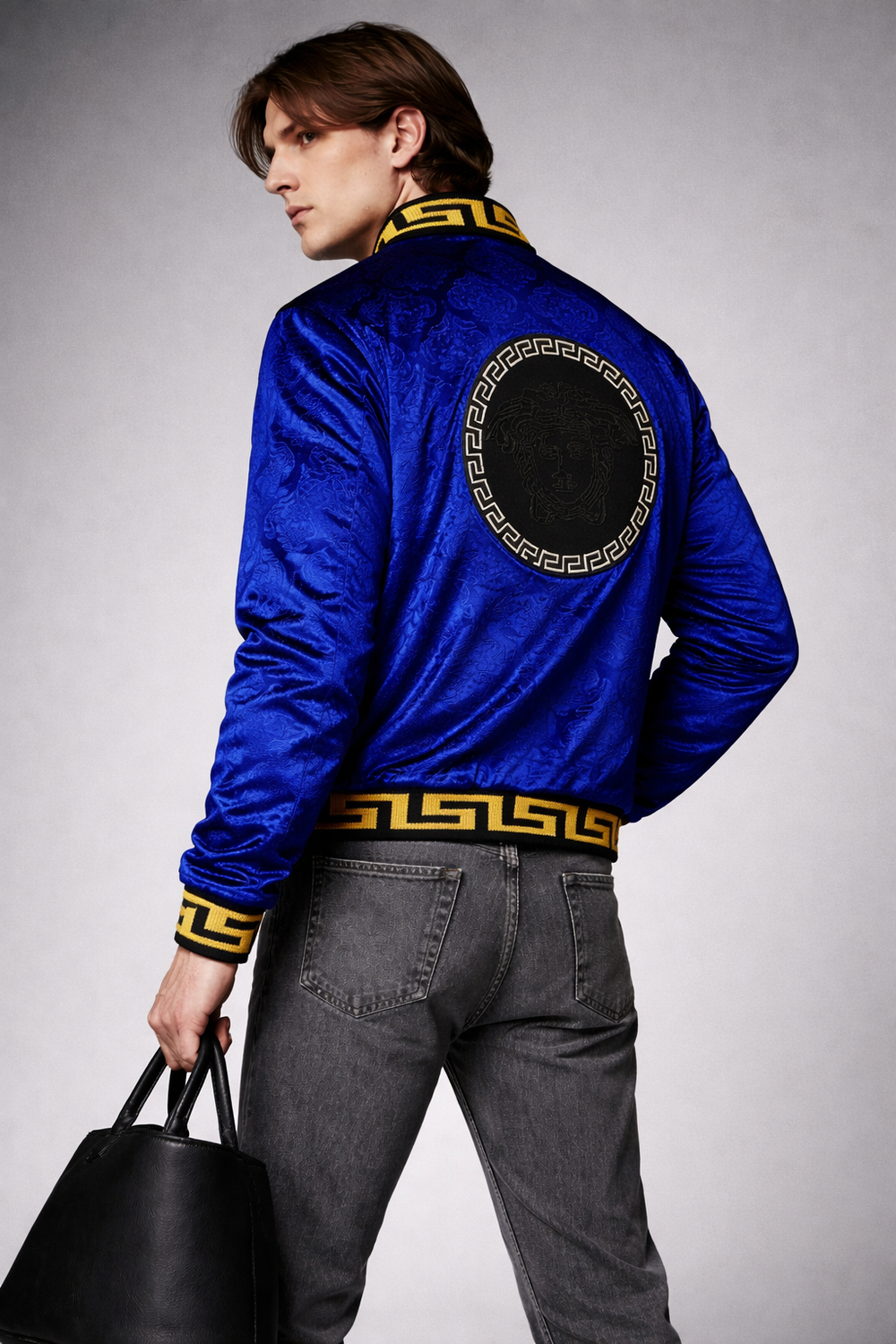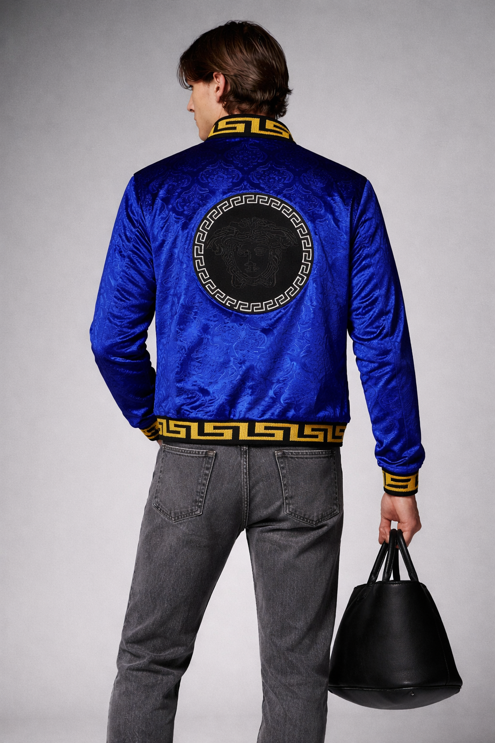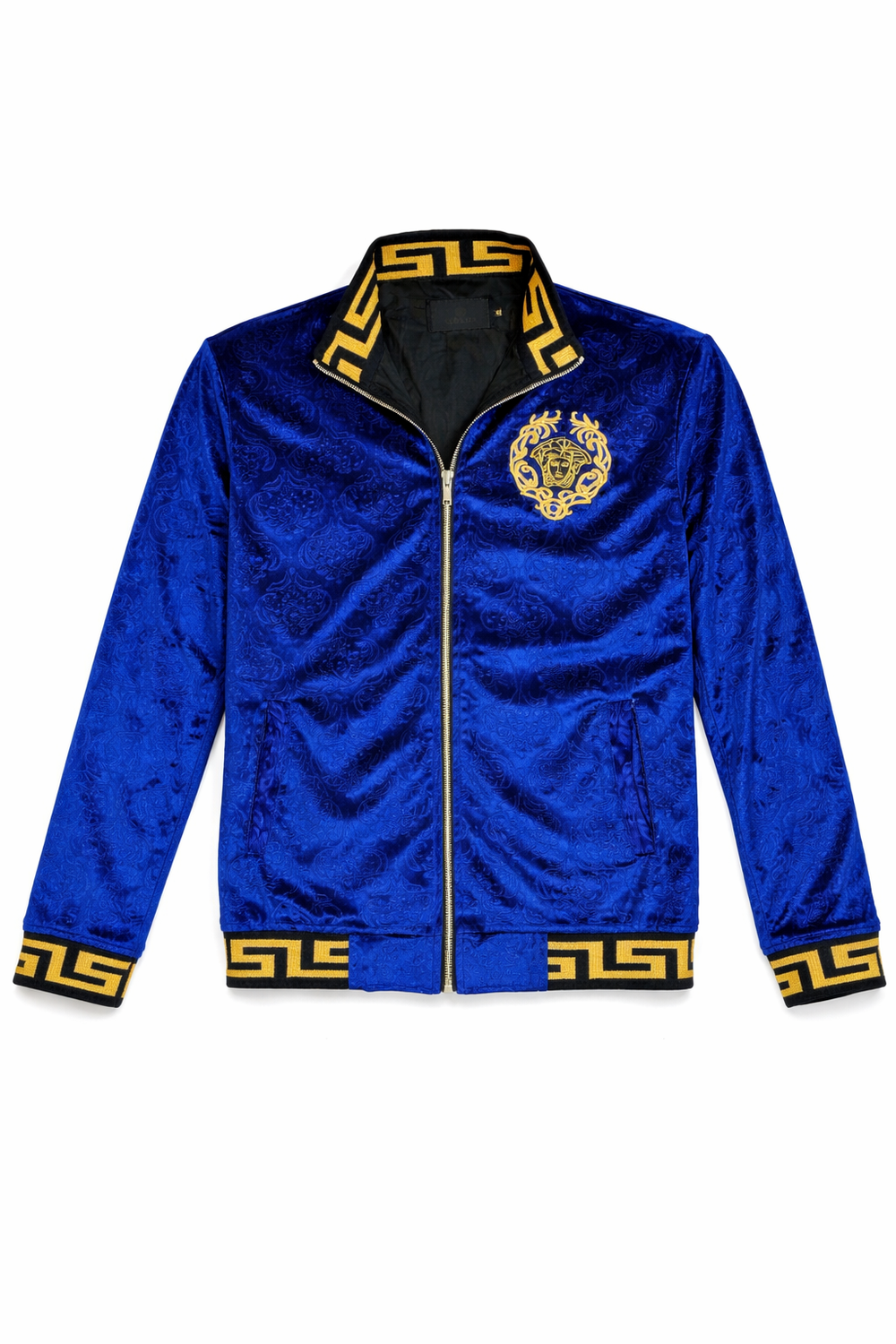 Step into a premium look with this royal blue velvet jacket featuring rich textured fabric and elegant gold embroidery. Designed with a full front zip closure, contrast patterned collar, cuffs, and hem, this jacket delivers a bold, luxury-inspired aesthetic. The soft velvet finish offers a smooth feel and standout shine, making it perfect for parties, evening wear, and high-fashion street style.