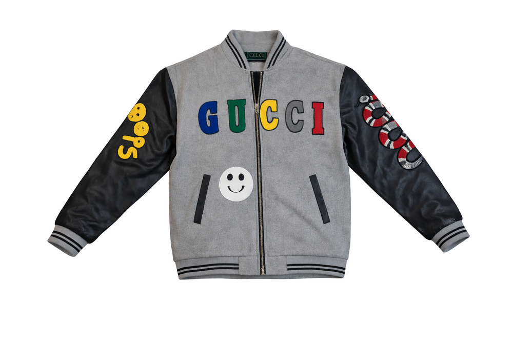 Back view of a grey Gucci varsity jacket styled on a male model, featuring a clean and minimal plain back design. The jacket has a soft wool-blend body with contrasting black leather sleeves and ribbed cuffs and hem for a classic varsity silhouette. Styled over a white hoodie and white trousers, this look highlights the jacket’s structured fit and premium finish, making it ideal for fashion catalogs, e-commerce listings, and lookbooks.