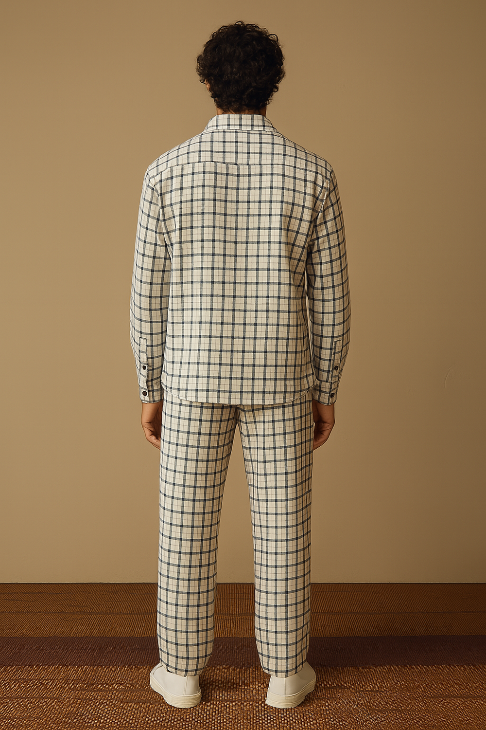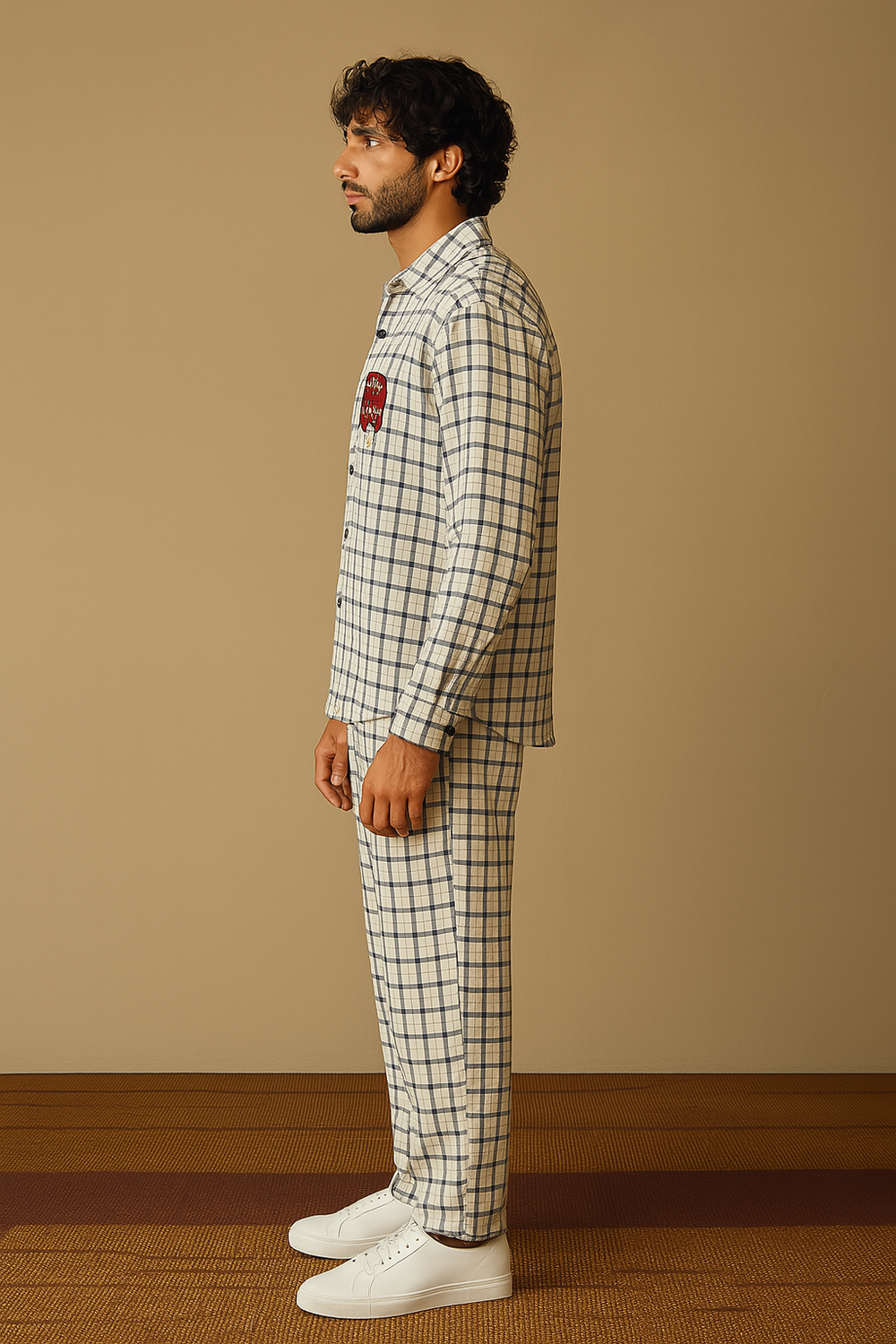 White Check Co-ord Set for Men – Baggy Fit | 4-Way Lycra | Drop Shoulder Full Sleeve Shirt & Pants
