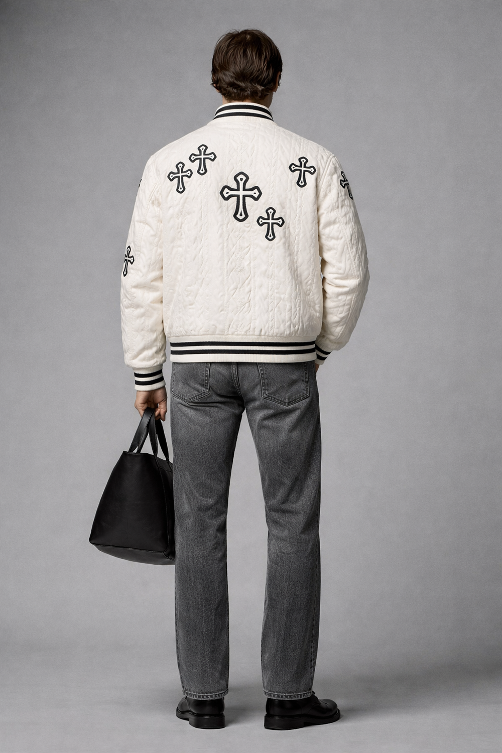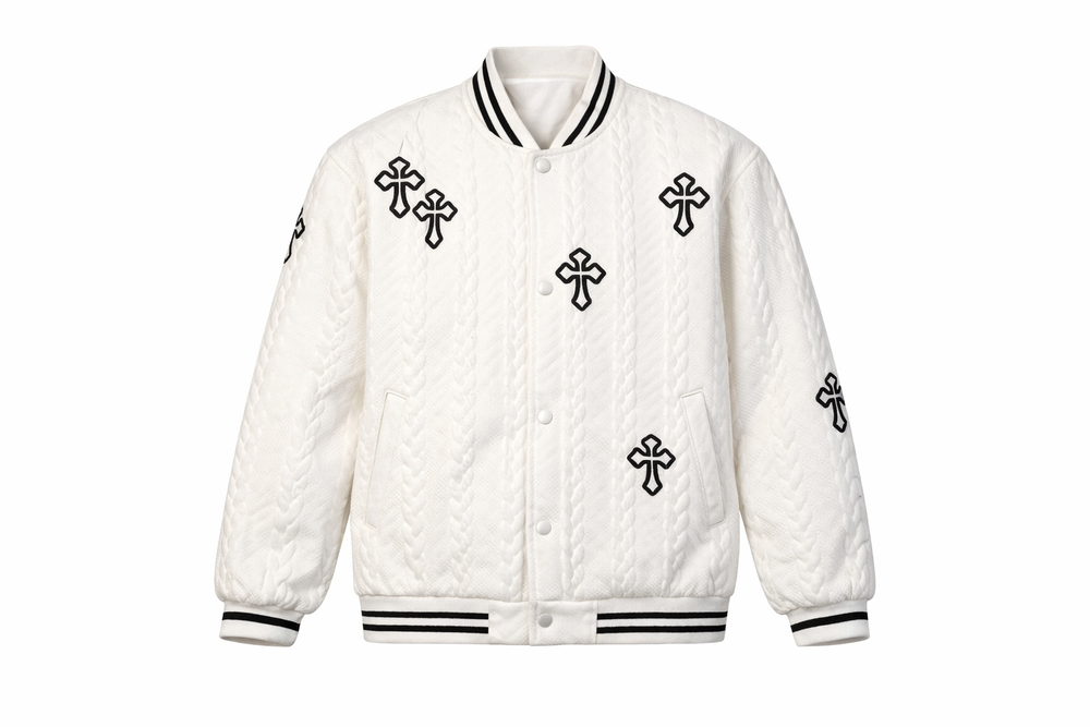 White Quilted Varsity Jacket with Embroidered Cross Motifs ā Snap Button Closure